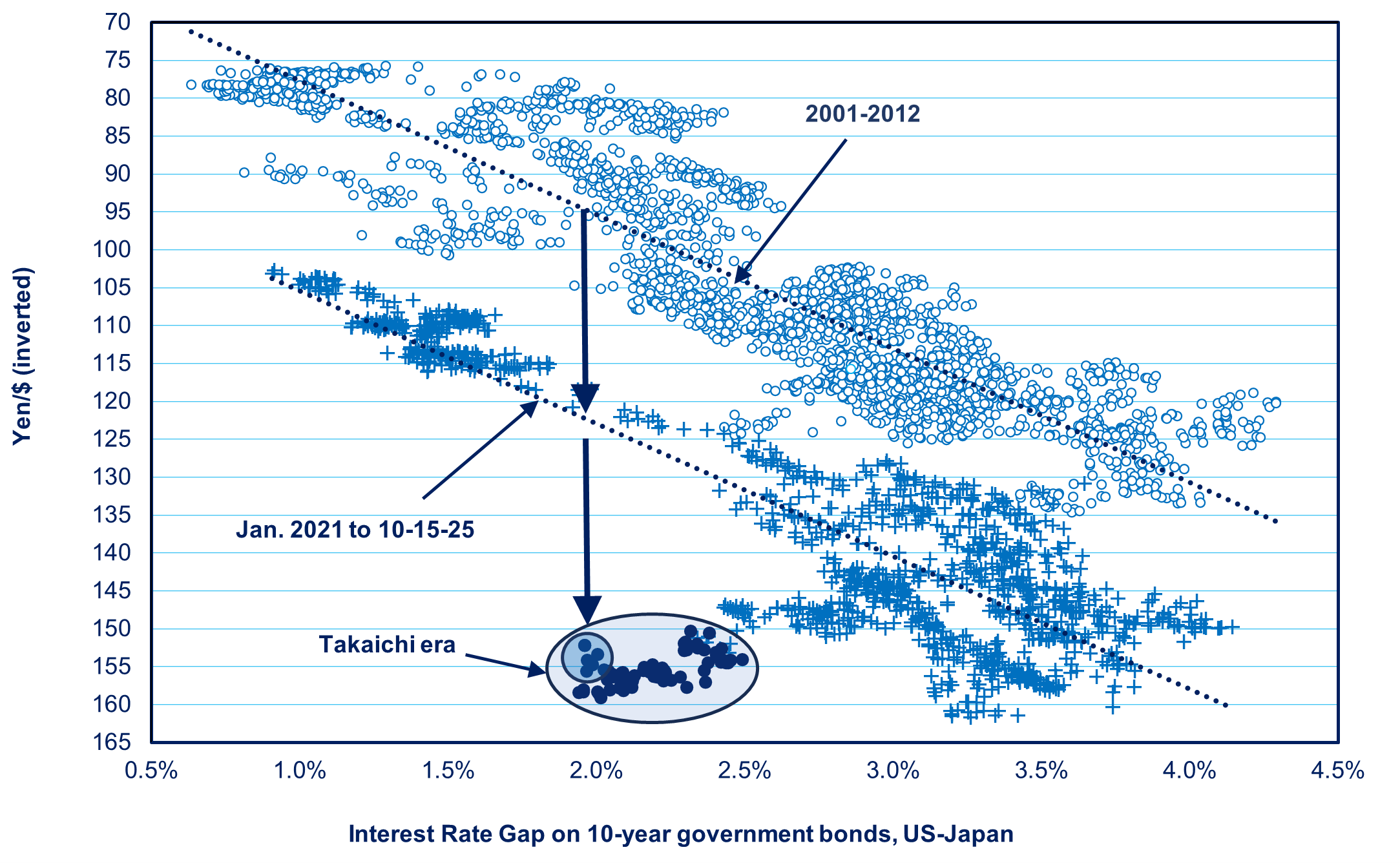 Note: Dots in the light blue oval cover the period since it became clear Takaichi would become Prime Minister; dots in the darker blue cover the period since the Fed asked Wall Street about yen transactions.