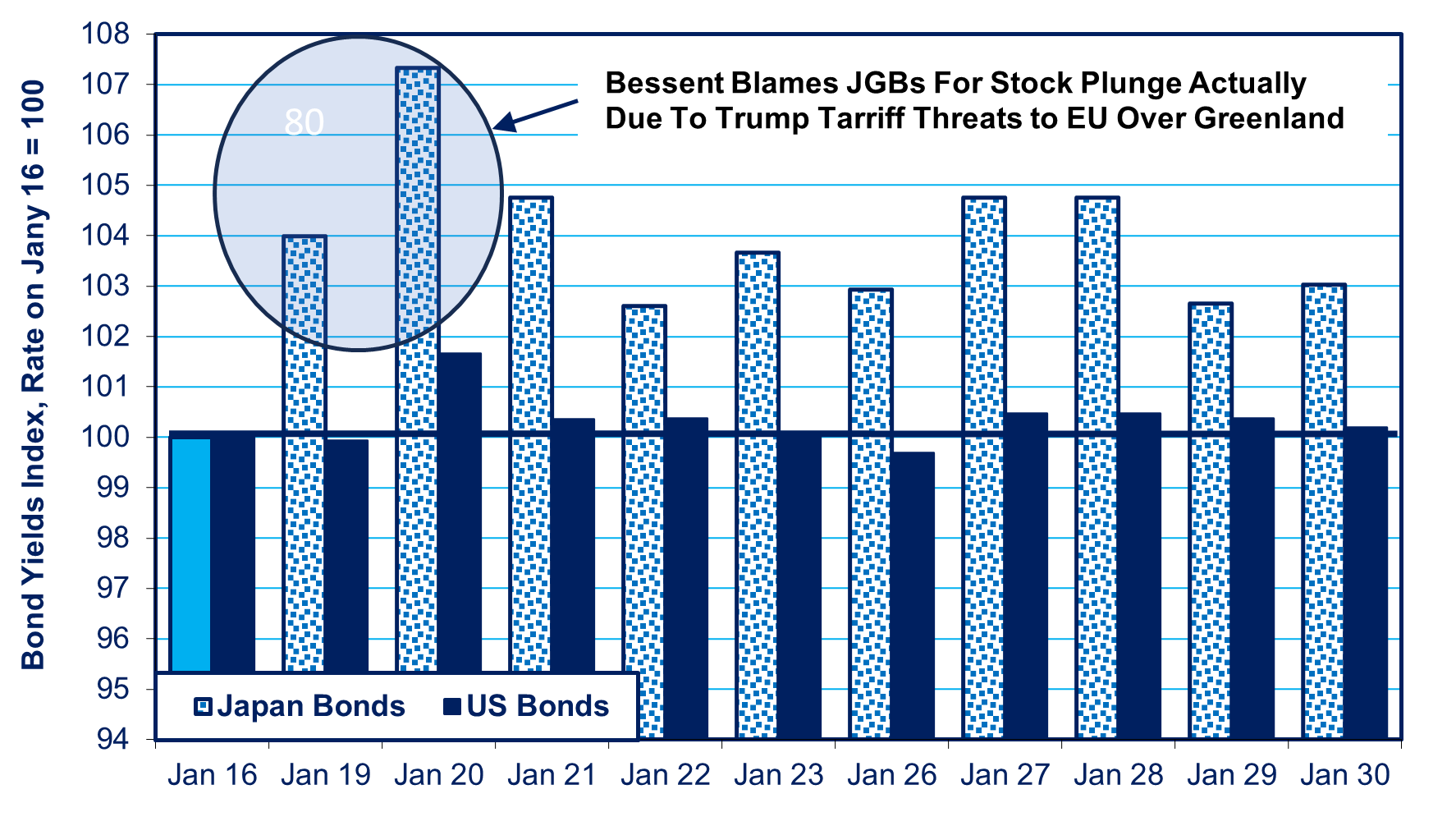 Trump’s tantrum happened to coincide with a rise in yields on Japanese Government Bonds (JGBs) due to Prime Minister Sanae Takichi’s January 19th announcement of a big fiscal stimulus package (see again chart on top). Bessent seized on this to con people into believing that the market turmoil arose from the JGB situation. He brazenly contended, “I think it’s very difficult to disaggregate the market reaction from what’s going on endogenously in Japan. Japan over the past two days has had a six standard deviation [i.e. a very extreme] move in their [government] bond market…and that that was happening before any of the Greenland news.” Unfortunately, he succeeded in getting a lot of the press to repeat this canard.