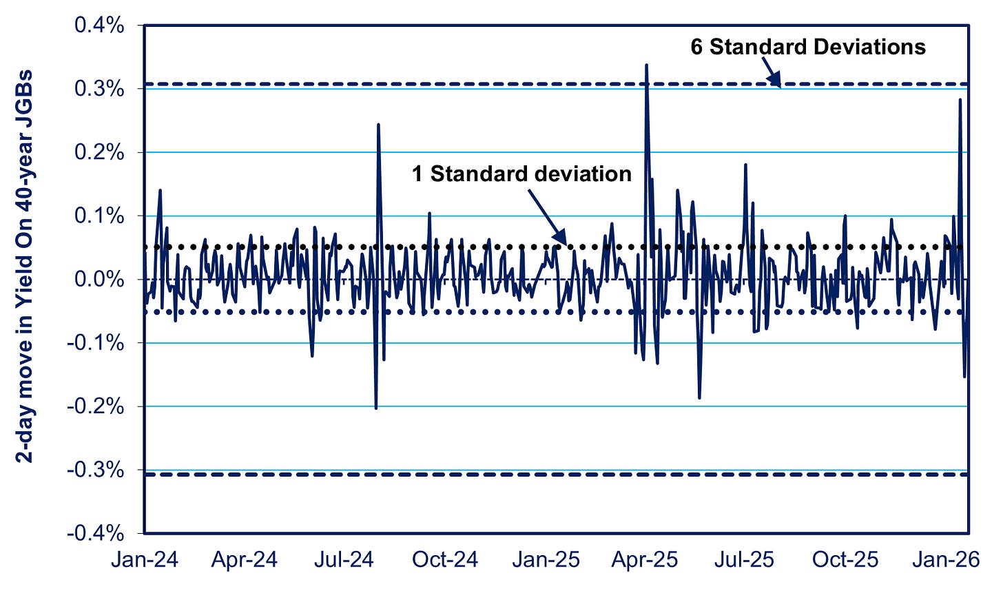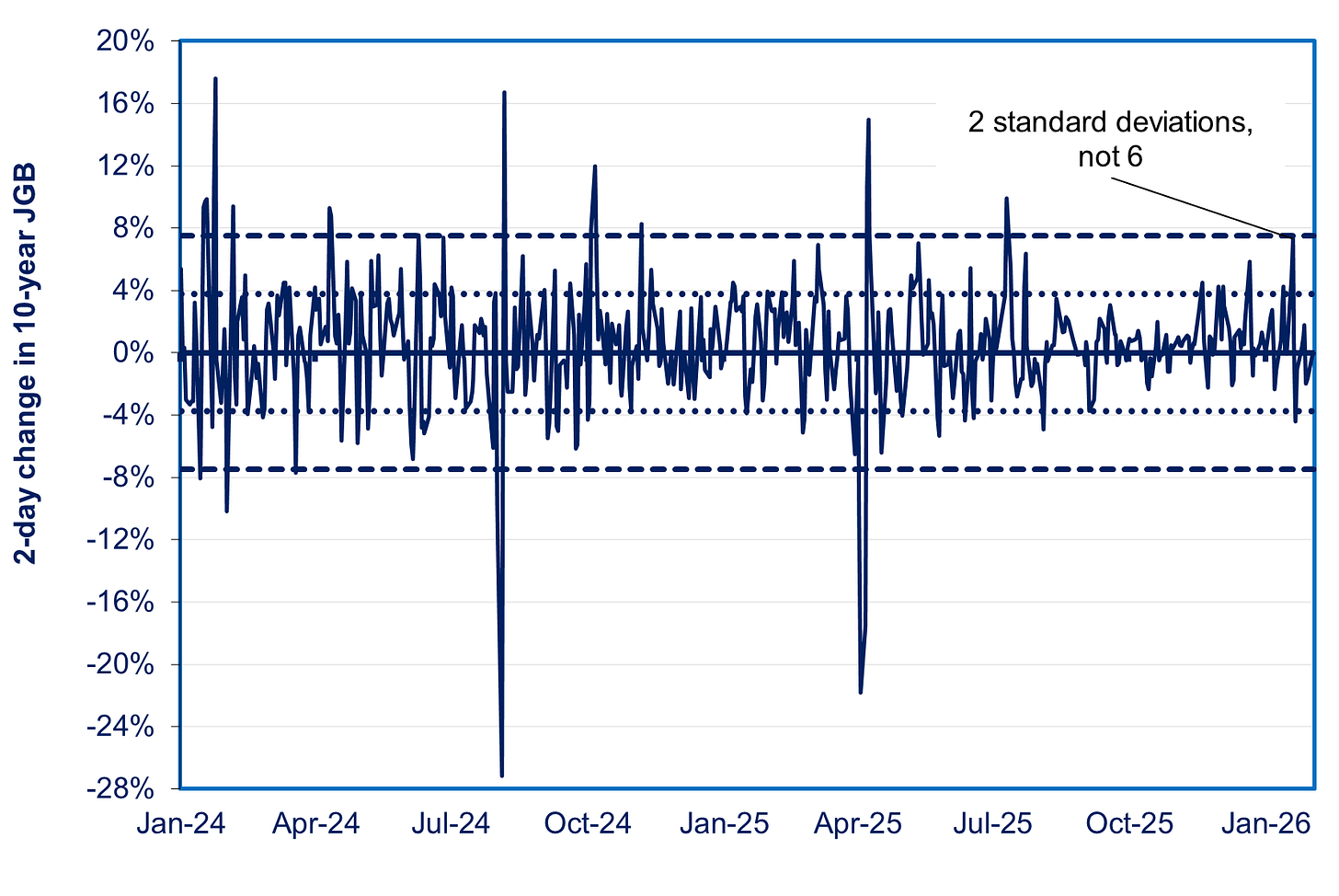 2) Talk of a six standard deviation move is not a lie but does mislead. Bessent omitted that this occurred only in the superlong 40-year JGB, whose thin trading volume makes it prone to excessive volatility. His wording implied that this volatility applied to the overall bond market. Standard deviation is where two thirds of the data points are located above and below the average level. The 40-year bond accounts for only a tiny share of outstanding JGBs, and small trades can cause it to gyrate wildly. On 19-20, a tiny $280 million in trading sent the 40-year JGB careening upwards and then it fell back down again. This has happened twice before in the last 18 months without causing international ripples (see the first of two charts below). To see the real situation, look at 10-year JGBs, the core of the $7 trillion JGB market. They moved just two standard deviations, something that happens on 5% of the trading days. It was a smaller move than some others in the past two years (see second of the two charts below). Bessent knows all this, of course, but he was desperate to blame someone else for the consequences of his boss’s blunders, a common assignment in this administration.