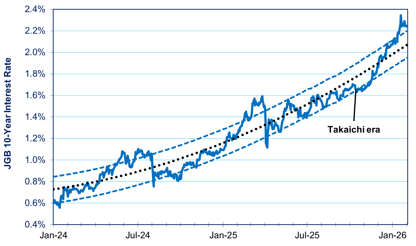 On December 26, the yield on regular 10-year JGBs was 2.05%. So, the “real” interest rate—the nominal yield minus the inflation premium (2.05% minus 1.8%)—was a mere 0.24%. That is extremely low. But it is determined by the supply and demand for long-term credit in the market for government and corporate bonds, bank loans, and other instruments. It therefore reflects the fundamental economic situation in Japan. In the last month, the JGB rate has since risen to around 2.25%, a rise of just 0.2 percentage points. It will take time to see how much of this is due to a rise in the inflation premium and how much is due to a rise in the real return. Both would be normal responses to Takaichi’s fiscal largesse. In any case, this is hardly wild and crazy market; it is one trying to return to normality after a long period of deflation.