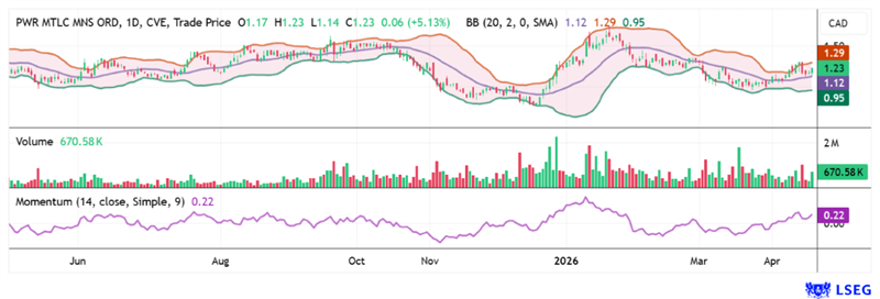 The 12-month chart of Power Metallic Mines shows clear stabilization within the Bollinger Bands with positive upward momentum. It is therefore expected that the PNPN stock could soon reach the upper band at over CAD 1.40. Source: LSEG Refinitiv, April 21, 2026