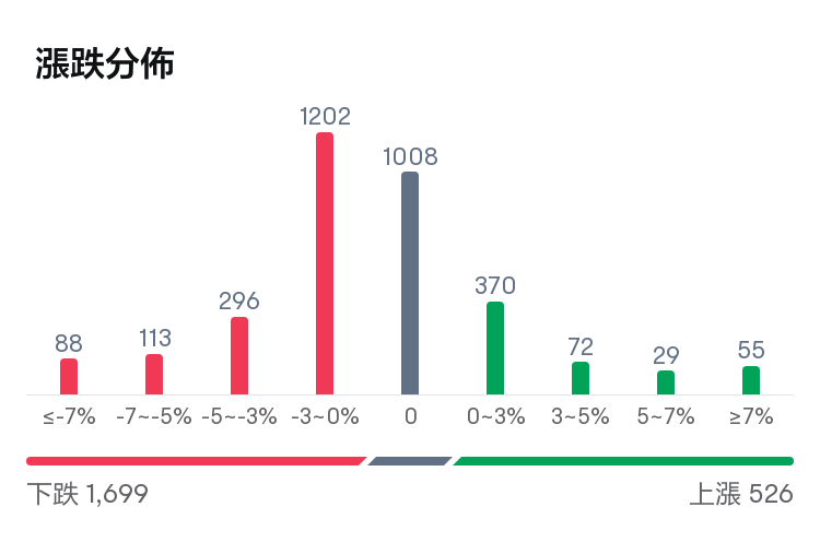By the close of trading, 526 Hong Kong-listed stocks had risen, 1,699 had fallen, and 1,008 remained unchanged.