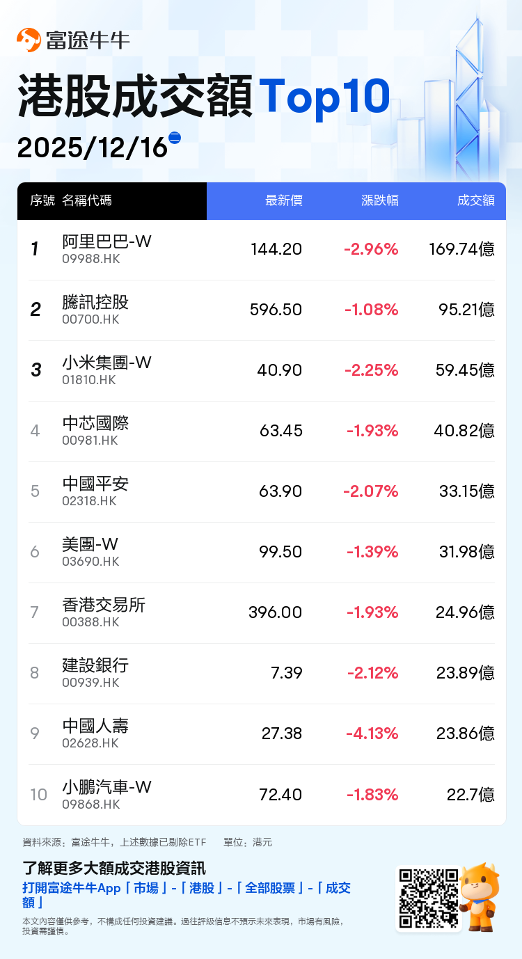 According to Futu News on December 16, Hong Kong’s three major indices all declined,$Hang Seng Index (800000.HK)$fell by 1.54%,$Hang Seng TECH Index (800700.HK)$fell by 1.74%,$Hang Seng China Enterprises Index (800100.HK)$fell by 1.79%.