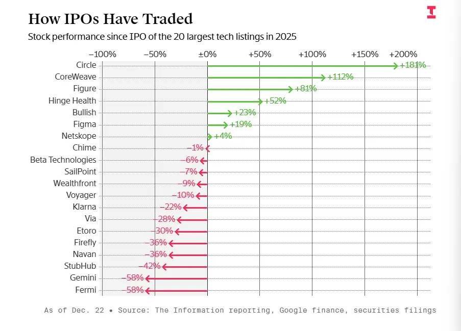In 2025, although there were signs of recovery in the number of tech company listings (around 23, significantly more than in 2024), overall performance was bleak: over two-thirds of companies saw their share prices fall below the issue price, with a median decline of 9%, significantly underperforming the nearly 18% rise in$S&P 500 Index (.SPX.US)$。
