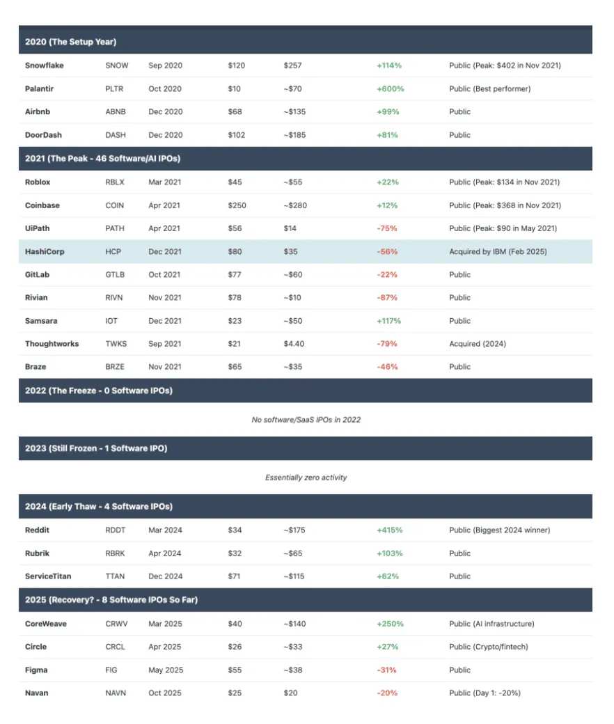 From a historical perspective, the recovery in 2025 is still far from reaching prosperous levels. Data from Accel Analysis and Qatalyst show that the number of IPOs in the software and AI sectors peaked between 2019 and 2021, with 13, 19, and 46 listings respectively. This was followed by a collapse during 2022-2023, with zero and one listing respectively, and then a recovery phase in 2024-2025 (4 and 8 listings).