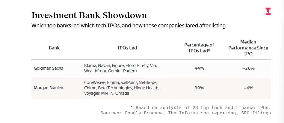 The subpar performance of IPOs in 2025 has placed investment banks Goldman Sachs and Morgan Stanley, which have led the majority of tech stock listings, in an awkward position.